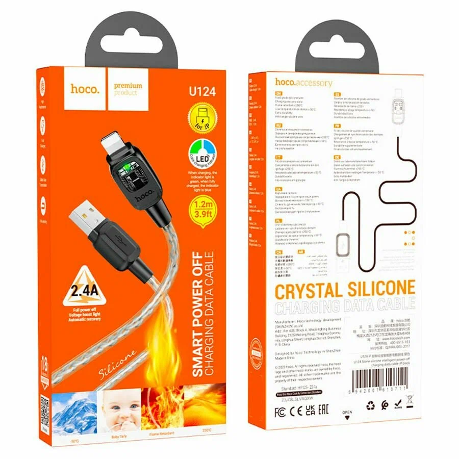 Зарядный кабель для передачи данных, Hoco U124, USB-A to Lightning, 2.4A, black(черный)
