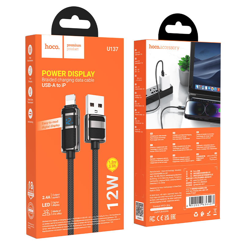 Зарядный кабель для передачи данных, Hoco U133, USB-A to Lightning, 2.4A, 1.2M, black(черный)